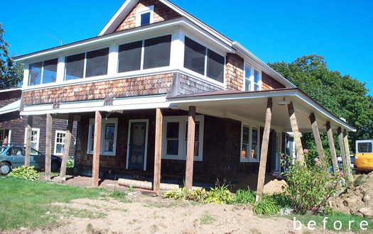 Because the house was low lying to the existing grade, we were able to maintain that relationship and the consequent visceral connection to the summer life on the front wrap around porch by using an ICF product called Durisol. A new ICF Durisol foundation was set below the existing home and the grade was cleared enough for a crawlspace to run ductwork.