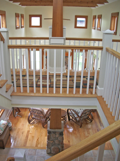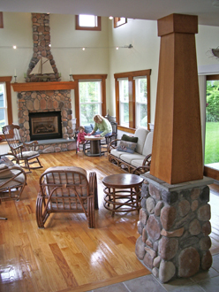 The building required a new foundation below the existing house and structural supports replacing existing locally harvested white cedar support posts. Insulated concrete forms (ICF) were used to create a new house foundation and new below grade basement/ workshop. A new detached two car garage was added to the rear of the house connected to the main house by a covered breezeway. The voluminous addition to the rear of the house contains; two additional bathrooms, a large two story living area, and a crafted open stair. The stair was sized to accommodate the potential future need for a mobility assistance device; elevator or chair lift.
